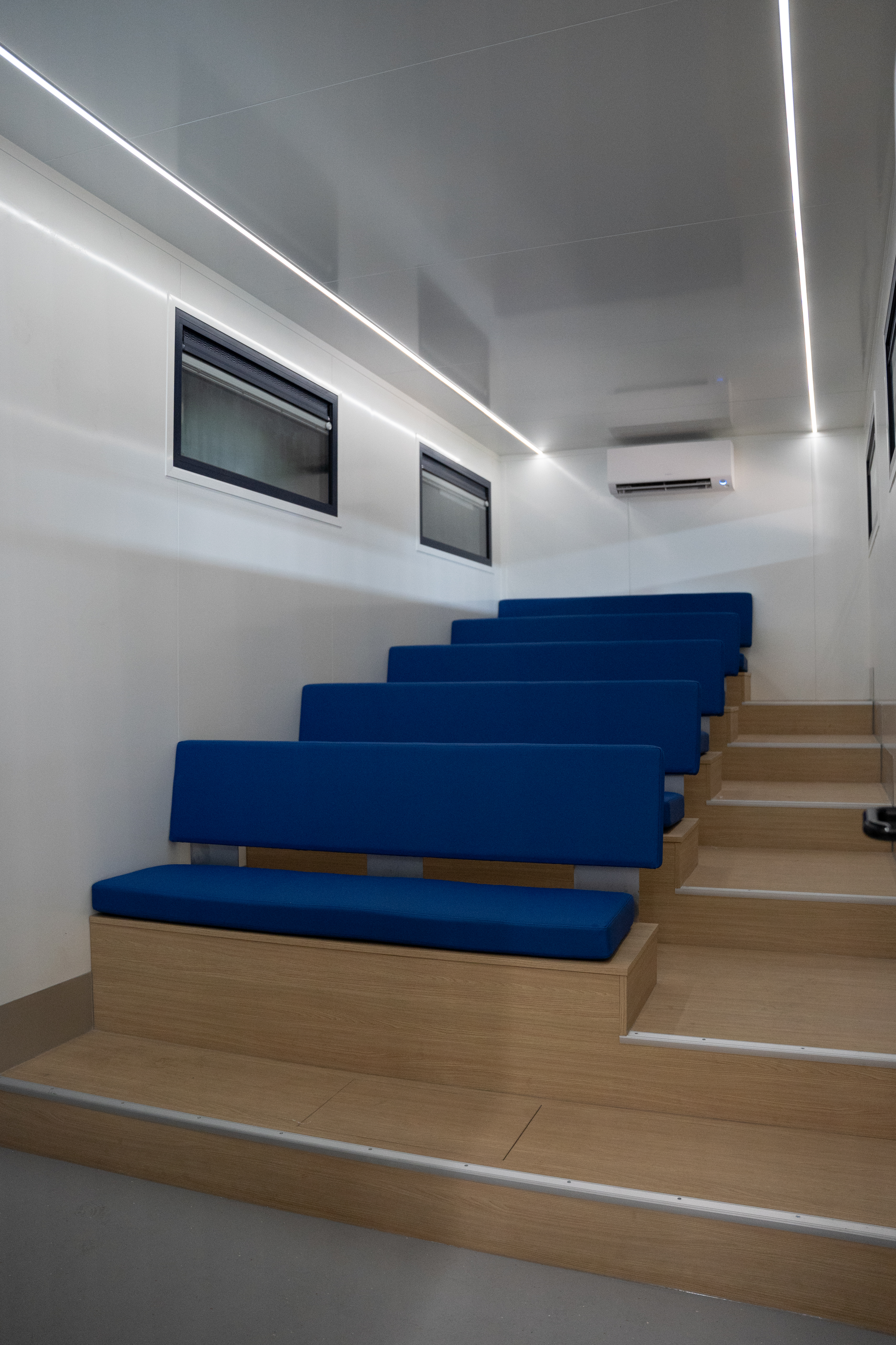 Dankzij een geïntegreerde lithium-ion batterijpack geniet de truck twee tot drie dagen autonomie, en kan ze volledig zelfstandig functioneren zonder afhankelijk te zijn van een externe 400V-aansluiting of een stroomgroep. Dit maakt de opleidingen niet alleen duurzamer, maar ook flexibeler inzetbaar op locatie.